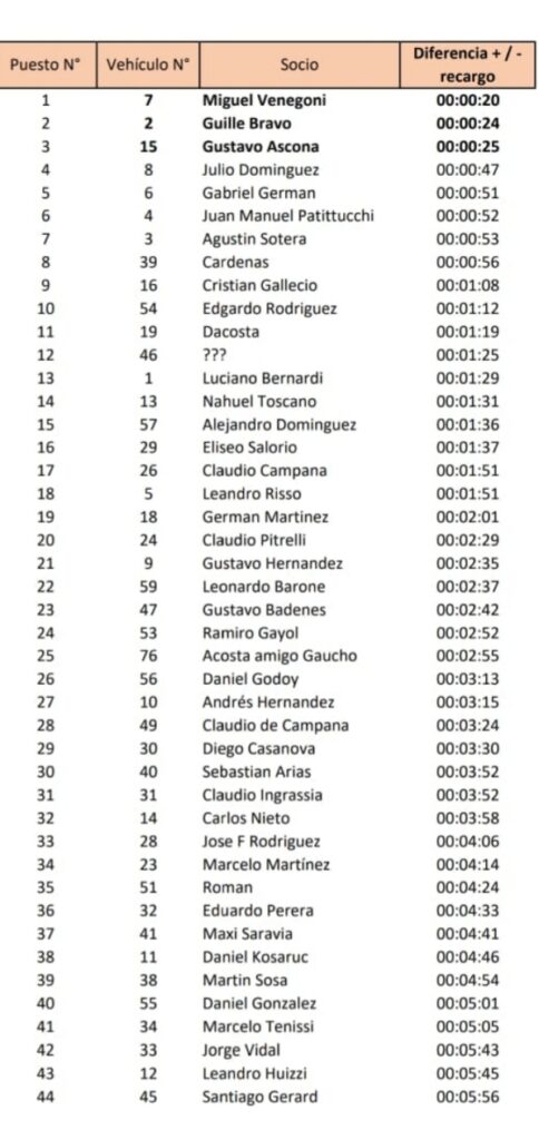 Resultados de la Carrera Publicado by Daniel Roca en 12 de noviembre de 20201 de diciembre de 2020 FELICITAMOS A LOS 60 SOCIOS QUE PARTICIPARON CON SUS AUTOS EN ESTA PRIMER EXPERIENCIA 1rer. Puesto MIGUEL VENEGONI 2do. Puesto GUILLERMO BRAVO 3rer. Puesto GUSTAVO ASCONA Continuar leyendo Artículo previo Carrera de regularidad 01.11.20Próximo artículo Reunion Enero 2021